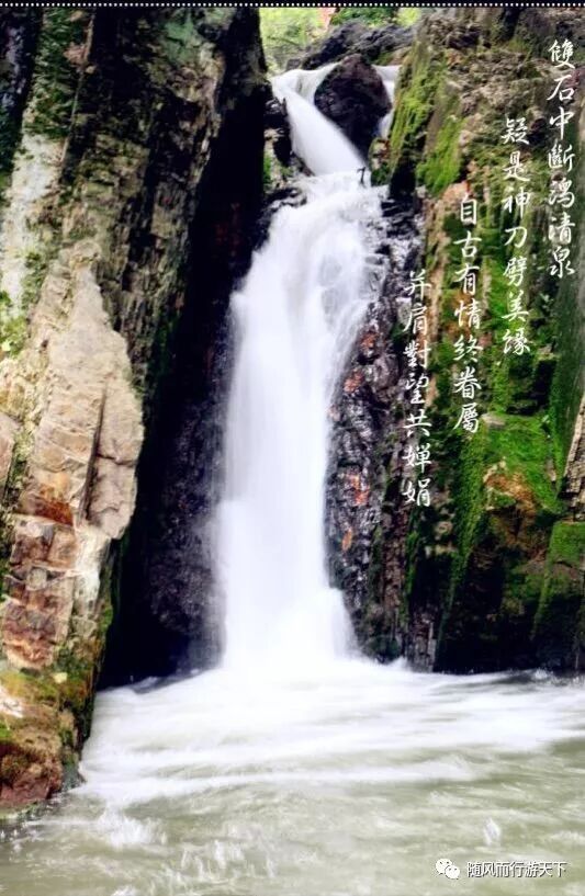 双石中断泻清泉,疑是神刀劈美缘。自古有情终眷属,并肩对望共婵娟。