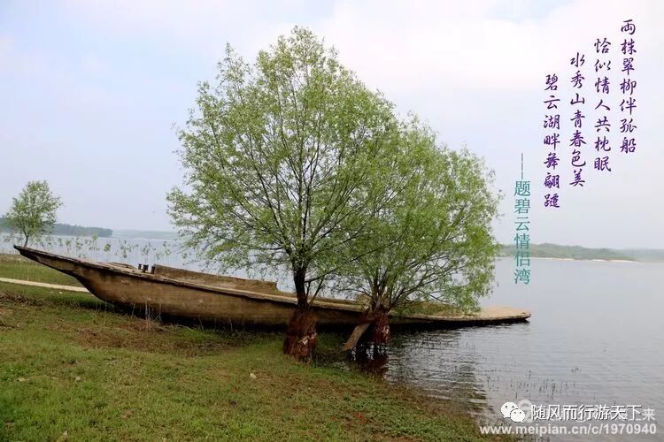 两株翠柳伴孤船,恰似情人共枕眠。水秀山青春色美,碧云湖畔舞翩跹。