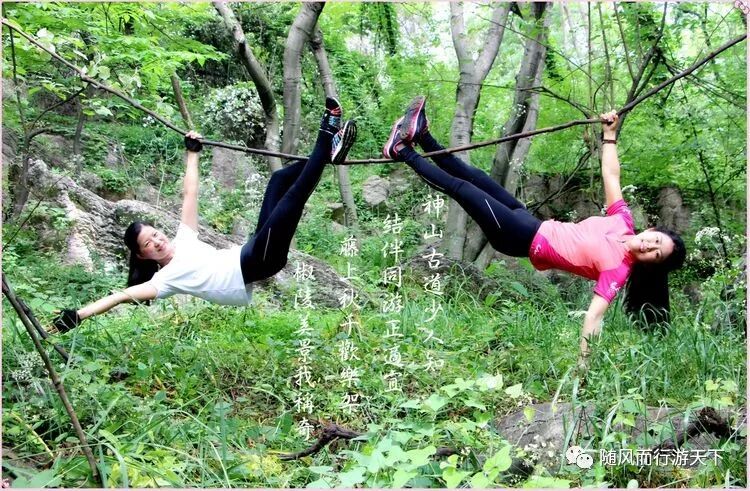 神山古道少人知,结伴同游正适宜。藤上秋千欢乐架,椒陵美景我称奇。