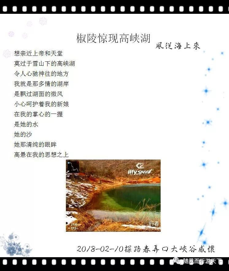 2018年2月10日,天奇单车探路小分队暴雪后深入神山春弄口大峡谷探路,在峡谷的最上方,忽然发现一座高高在上的“高峡湖”,残雪映照下尤为清纯而惊艳,这样的奇景当地人一般是看不到的,唯有无私无畏的骑行人可以一饱眼福。即兴胡诌一首,聊以抒怀!