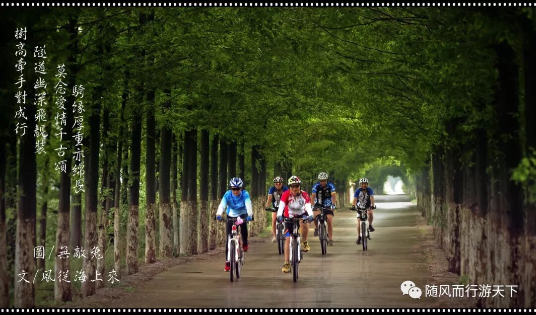 树高牵手对成行,隧道幽深飞靓装。莫念爱情千古颂,骑缘厚重亦绵长。