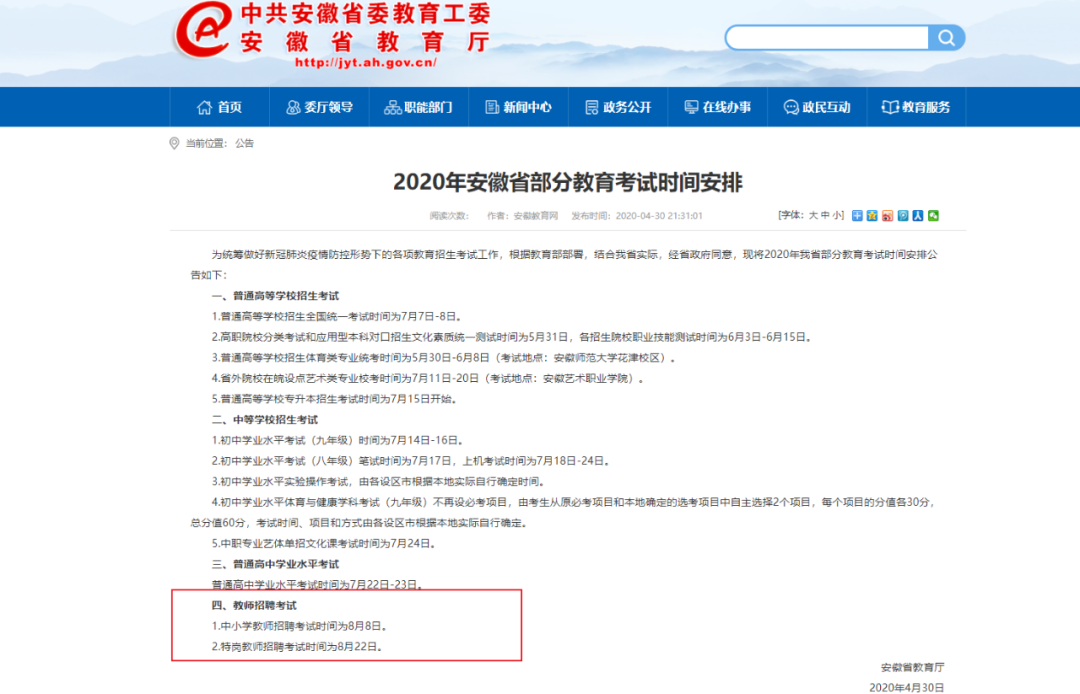 4月30日晚9:30安徽省教育厅发布了《2020年安徽省部分教育考试时间安排》,通知中明确2020年安徽省中小学教师招聘考试(统考)时间8月8日,特岗笔试时间8月22日。