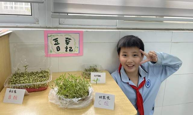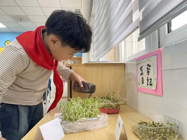 他们精心挑选颗粒饱满的豆子,小心翼翼地给种子们安家,细心浇水呵护。一天、两天、三天……豆芽更加丰满了,胚芽破壳而出,伸出了小芽,犹如一个个可爱的小逗号。慢慢地,那小芽长长了,长出了叶子。
