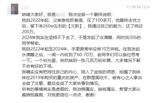 “网络上也有一些造谣和网暴,我现在也懒得去辟谣,水滴筹的肯定会退款,大部分转账给我的已经都已退款,还有一些零星的也在联系。”