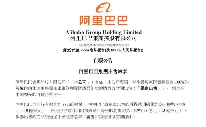 刚刚,阿里在港交所发布公告,同意将所持全部银泰股权以约74亿元人民币向雅戈尔集团和银泰管理团队成员组成的买方财团出售(约占银泰股权的99%)。这意味着阿里巴巴将面向未来持续聚焦核心主业。同时,阿里方面表示,期待银泰在雅戈尔集团的支持下继续创业,打开更大发展空间。